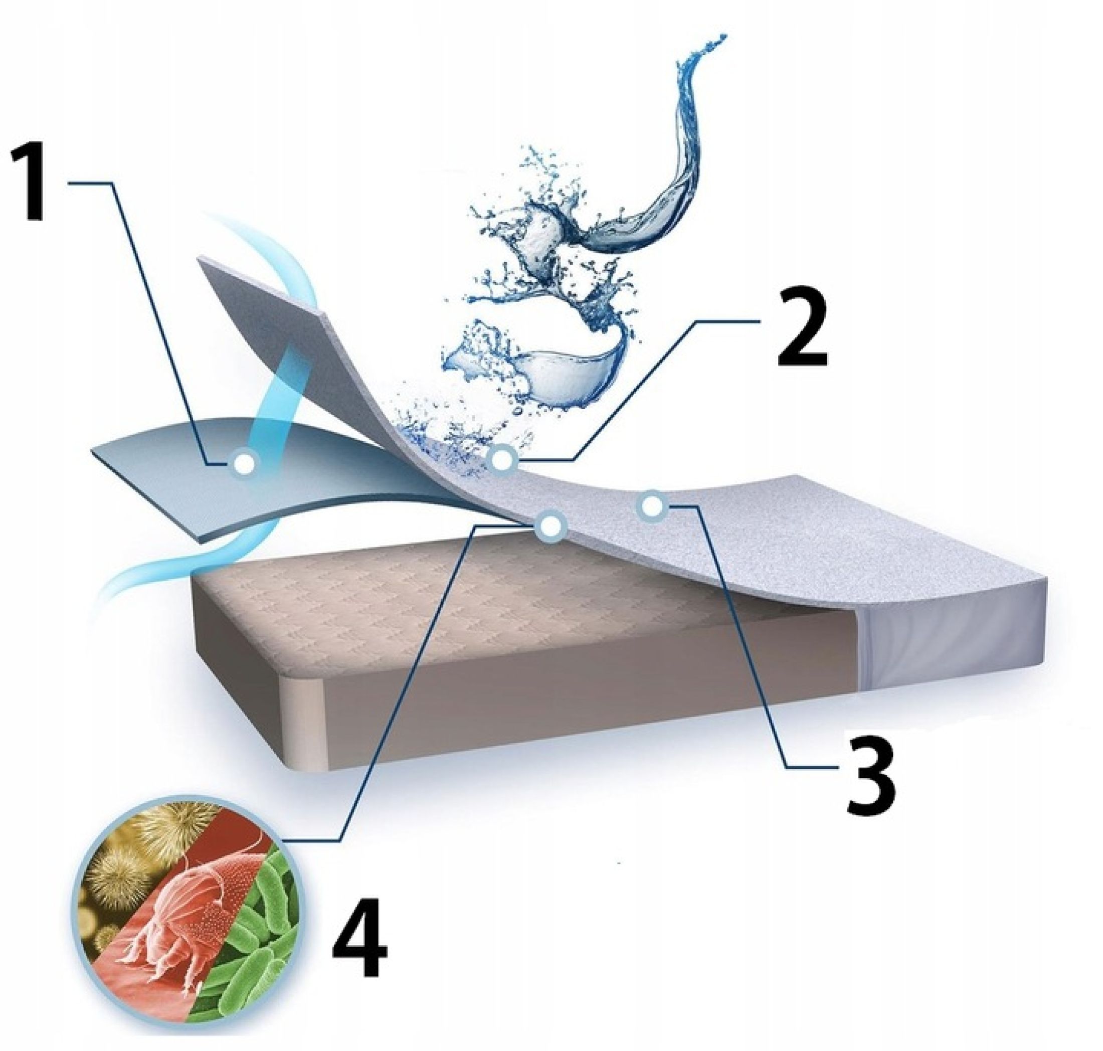 Nakładka na materac wykonana jest z dwóch materiałów: delikatnej i przyjemnej bawełny frotte oraz z dolnej, wodoodpornej membrany poliuretanowej. Dzięki podwójnej budowie bardzo dobrze chroni materac przed zabrudzeniem, zamoczeniem, a nawet rozwojem roztoczy, bakterii i grzybów.